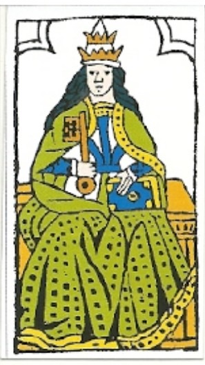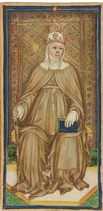 The papess in the Visconti Sforza tarot from the late 1400’s is thought to be Guglielma (or Wilhelmina) of Bohemia, known as Sister Manfreda. In later packs she’s said to be Pope Joan and older tarots often show her holding a bishops’ crook or crozier, with a book of knowledge, while wearing the papal crown and holding the keys of St Peter, also called the Keys of Heaven.