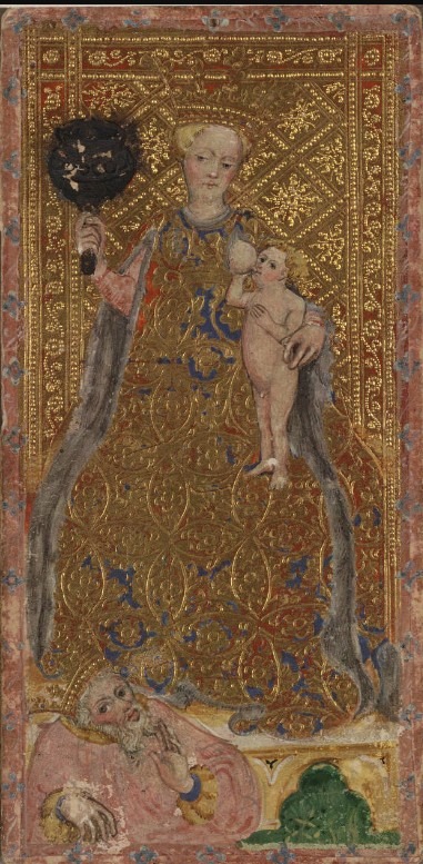 The primary colours of the card are blue and blue has long been associated with the Catholic Mary. This complex card contains multiple layers of imagery.